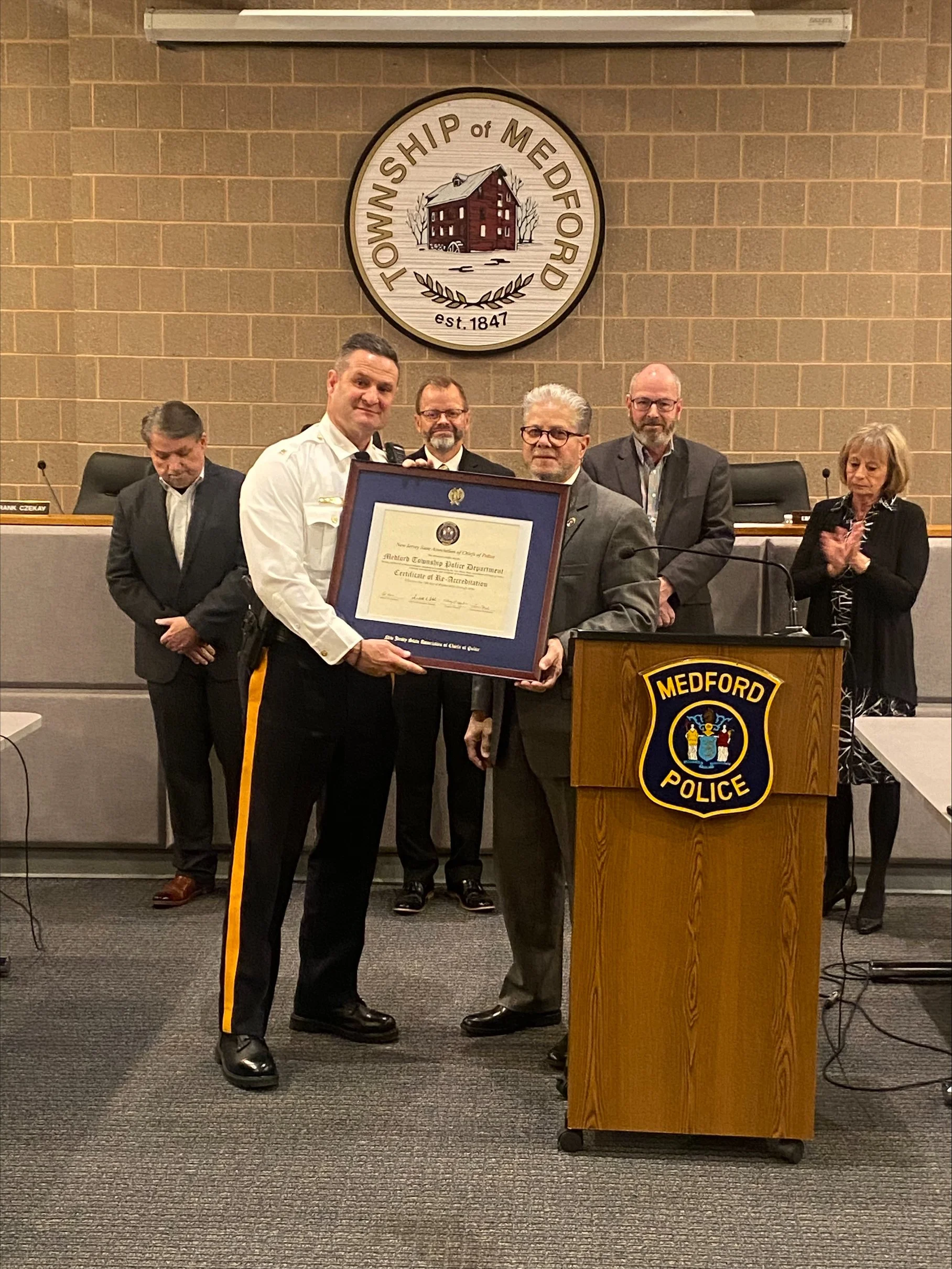 On April 14, 2011, the New Jersey State Association of Chiefs of Police and the New Jersey Law Enforcement Accreditation Commission, by unanimous vote granted the Medford Police Department their official accreditation status. The Commission hearing was held in Princeton, NJ. Chiefs, Executive Officers and staff from Law Enforcement agencies throughout the state attended the hearing.